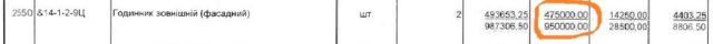 По итоговой ведомости ресурсов без доставки и НДС, двое внешних фасадных часов купили по 475 тыс грн. за каждый. По сопоставимую сумму можно купить новый внедорожник Renault Duster Life или однокомнатную квартиру без ремонта в новостройке в Ирпене.