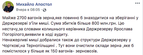 Почти 2700 вагонов зерна, которое должно было находиться на хранении в Госрезерве, съели мыши. Об этом на странице в Facebook написал советник министра внутренних дел Михаил Апостол, передает FaceNews.ua.