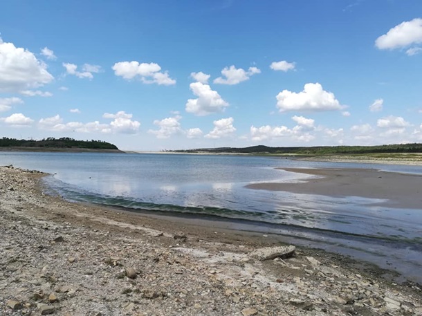 На фото видно, что Симферопольское водохранилище пересыхает, вода отступает.