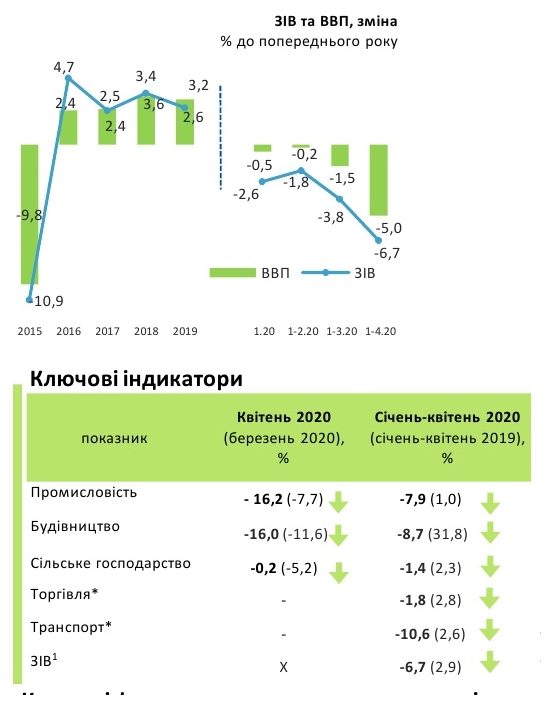 По итогам января-апреля сокращение сводного индекса производства товаров и услуг по основным видам экономической деятельности (СИП) составило 6,7% (падение на 3,8% в январе-марте).