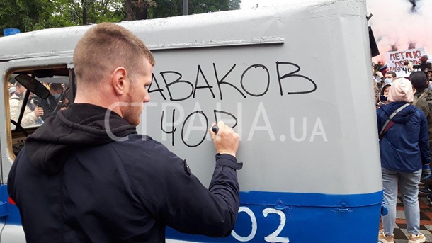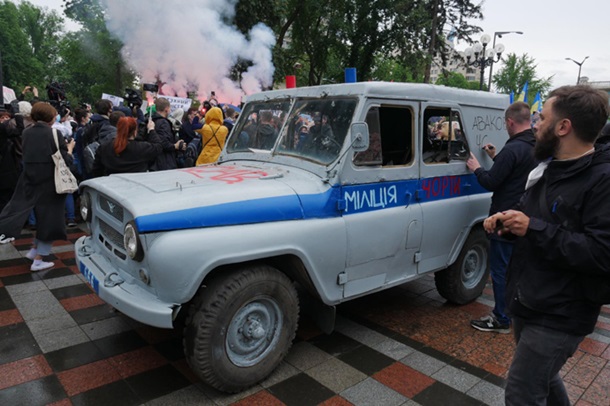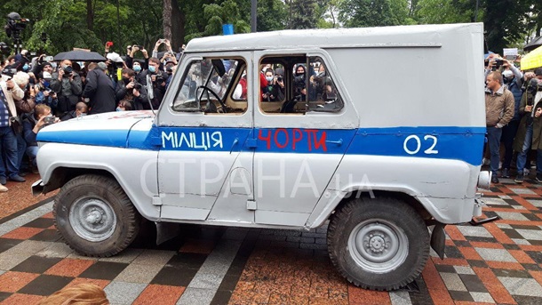 Автомобиль представляет из себя старый милицейский внедорожник и по мнению протестующих должен символизировать полицию и Авакова.
