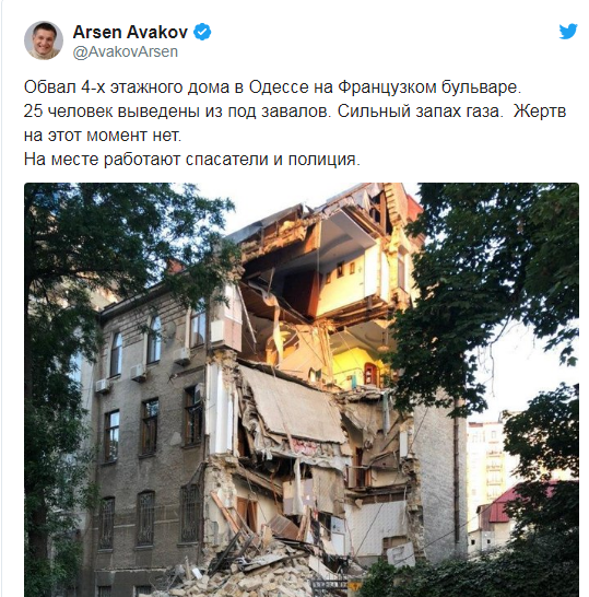 Как сообщил глава МВД Арсен Аваков в Twitter, рухнуло четырехэтажное здание. Из-под завалов вывели 25 человек, информации о жертвах пока не поступало.