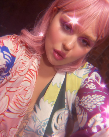 Зарицкая предстала перед камерой с розовыми волосами и в шелковом разноцветном халате. Певица продемонстрировала пышную грудь, оставив глубокий вырез в зоне дельте.
