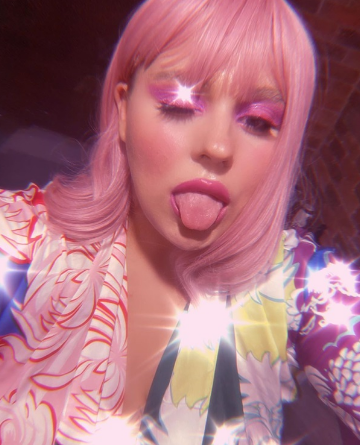 Образ Зарицкая дополнила ярко-розовыми тенями и помадой. На одном из снимков артистка показывает язык.