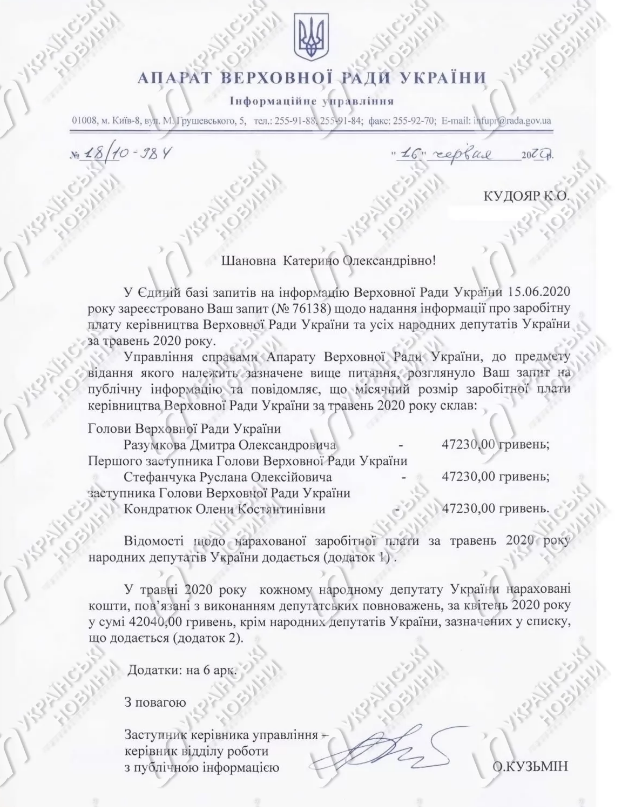 При этом собственно зарплаты за май Разумкову, Стефанчук и Кондратюк выплачено 47 230 грн., в соответствии с карантинными ограничениями зарплат.