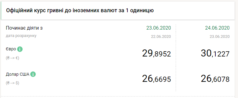 Национальный банк на среду, 24 июня, укрепил курс гривны более чем на шесть копейки по отношению к доллару и понизил на 23 копейки к евро. Об этом свидетельствуют данные НБУ, передает FaceNews.ua.