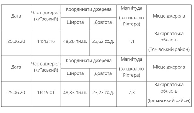 Так, подземные толчки были зафиксированы 25 июня в Тячевском и Иршавском районах Закарпатья. Первое землетрясение магнитудой 1,1 балла по шкале Рихтера произошло в 11:43. А второе, магнитудой 2,3 балла – в 16:19.