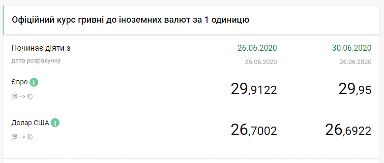 Национальный банк на понедельник, 30 июня, укрепил курс гривны на 0,8 копейки по отношению к доллару и ослабил на 3,1 копейки к евро, передает FaceNews.ua. Об этом свидетельствуют данные НБУ, опубликованные в пятницу, 26 июня.