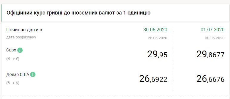 Национальный банк Украины на среду, 1 июля, укрепил курс гривны менее чем на 3 копейки по отношению к доллару и почти на 9 копеек по отношению к евро. Об этом свидетельствуют данные на сайте НБУ, передает FaceNews.ua.