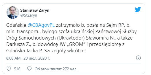 "Гданьское Центральное антикоррупционное бюро задержало бывшего члена Сейма Республики Польша, бывшего министра транспорта, бывшего председателя Государственной службы автомобильных дорог Украины (Укравтодор) Славомира Н. (Новака - ред.), а также Дариуша З., бывшего командира JW "GROM" и предпринимателя из Гданьска Яцека П. Подробнее вскоре!" - сообщил пресс-секретарь министра-координатора специальных служб Польши Станислав Зарин в Twitter.