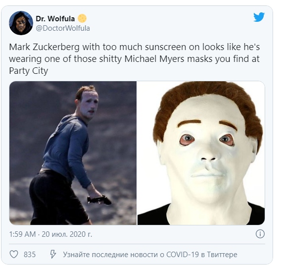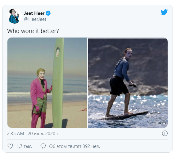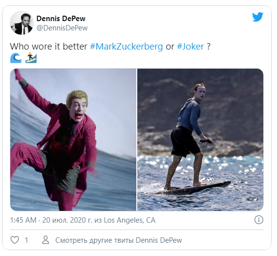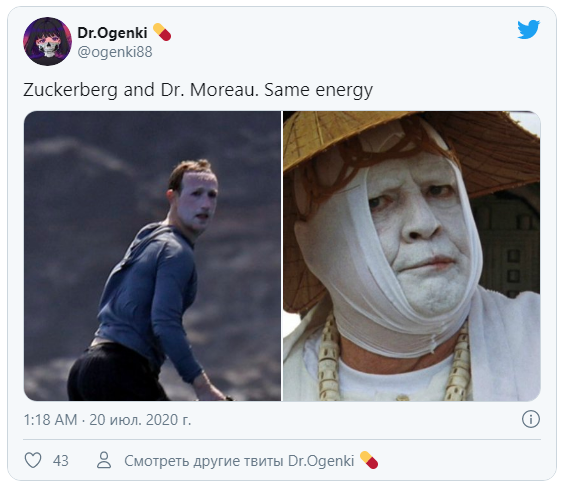 Фото сделали папарацци, и снимки тут же разлетелись по интернету. Теперь 36-летнего Цукерберга сравнивают с Джокером, с доктором Моро и даже с Дональдом Трампом. А некоторые вообще решили, что Цукерберг – рептилоид.