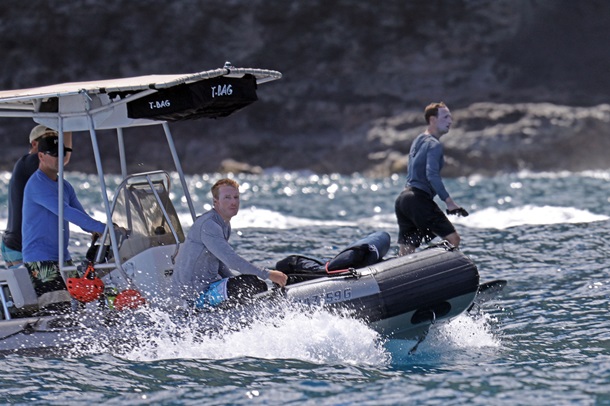 Бизнесмен покорял океанские волны на электрическом серфборде. Его телохранители и профессиональный серфер Кай Ленни следовали рядом на моторной лодке.