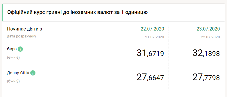 Что касается евро, то его курс поднялся выше 32 гривен впервые за полтора года. Выше курс был только 14 января 2019 года – 32,4699 гривен за евро.