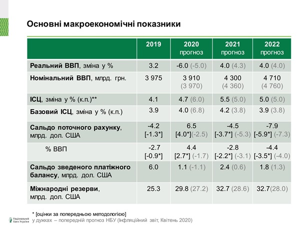 По прогнозу НБУ, экономика Украины сократится в 2020 году на 6,0%. В то же время ожидается, что в 2021 году восстановительный рост составит 4,0%.