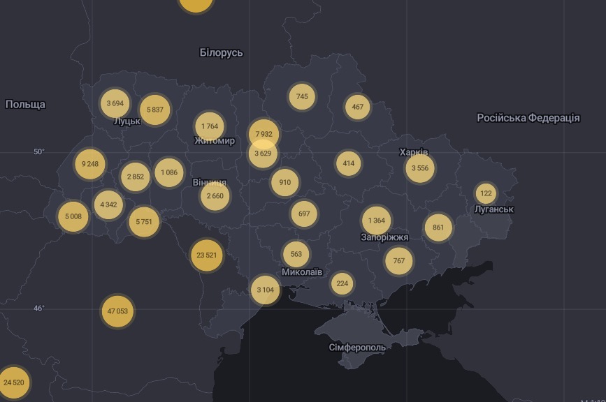 По данным системы мониторинга распространения пандемии коронавируса на электронной карте, созданной главным ситуационным центром Украины в Аппарате совета национальной безопасности и обороны Украины, из 67 597 больных COVID-19 в Украине за последние сутки обнаружили 1022 инфицированных.