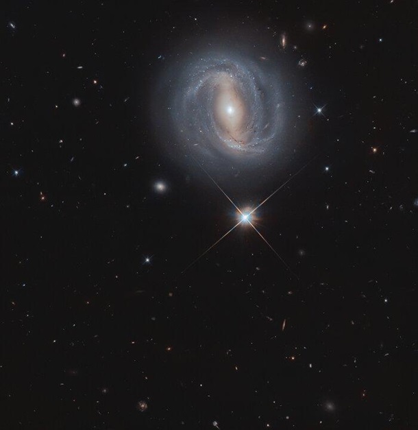 Под диском галактики заметна яркая звезда. Астрономы отметили, что она на самом деле находится во Млечном Пути.
