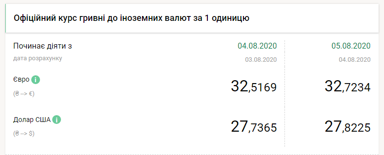 Национальный банк на среду, 5 августа, ослабил официальный курс гривны до 32,7234 грн/евро по сравнению с 32,5169 грн/евро днем ранее. Об этом говорится в сообщении НБУ, передает FaceNews.ua.