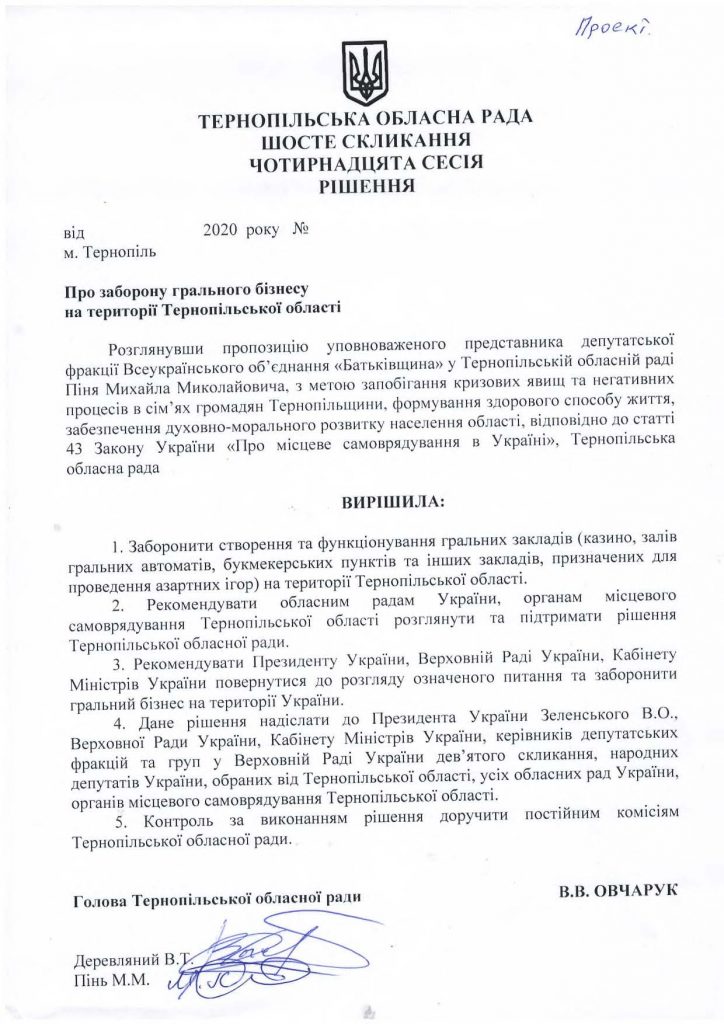 Он отметил, что решение о запрете игорного бизнеса на территории Тернопольской области поддержали 34 депутата.