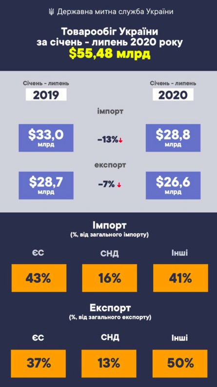 "За январь-июль 2020 года товарооборот Украины составил 55,48 млрд долларов. В Украину импортировали товаров на более 28,8 млрд долларов (по сравнению с аналогичным периодом 2019 года импорт уменьшился на 4,2 млрд долларов или на 13%)", - говорится в сообщении Государственной таможенной службы.