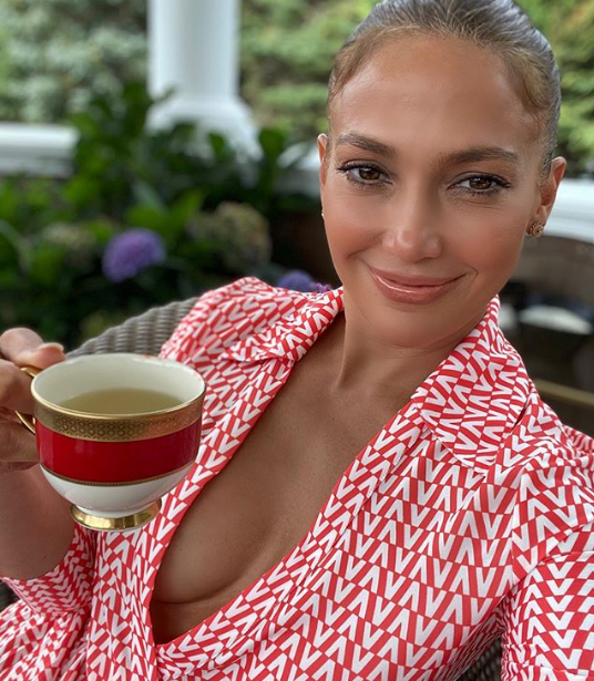 На селфи в Instagram звезда запечатлела себя в момент “воскресного чаепития” на крыльце своего дома. Джей Ло держит в руке чашку и смотрит в кадр.
