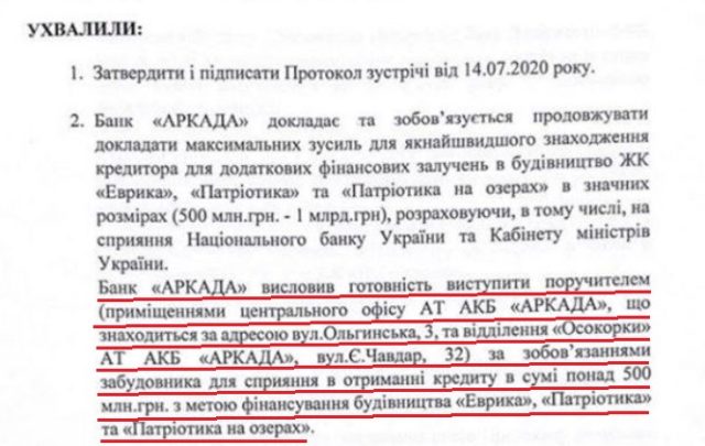 Стоит отметить, что 14 июля банк «Аркада» подписал "протокол согласия" с инвесторами, в котором банк обязался привлечь 500 млн грн кредита для достройки трех жилых комплексов, отдав в залог помещение центрального офиса «Аркады» на ул. Ольгинской, 3 и отделения на ул. Е.Чавдар, 32.
