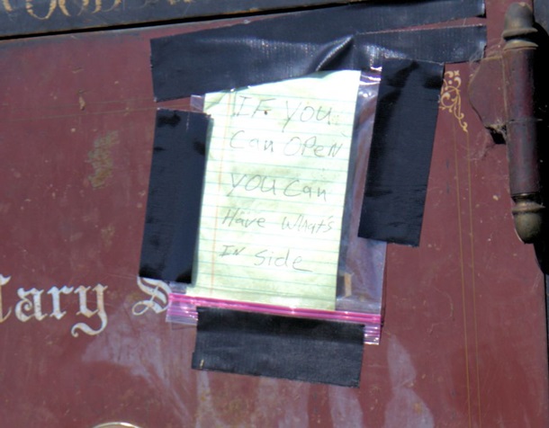 "Открывший получит содержимое", - было написано на бумаге, прикрепленной к сейфу, который, судя по размерам, весит 200-250 килограммов, пишет 13 WHAM