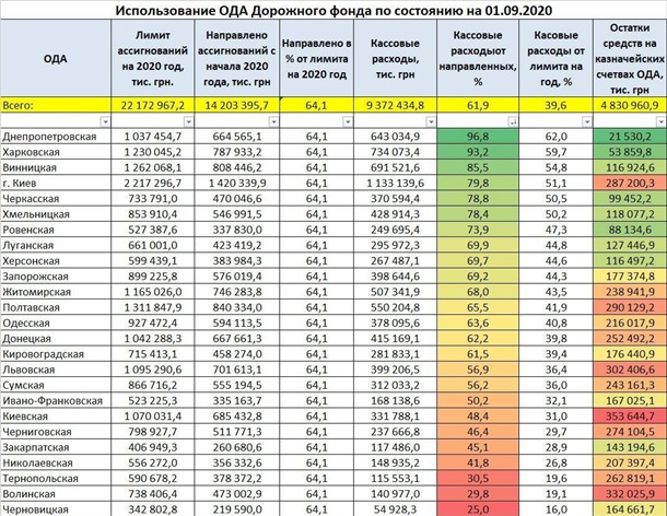 В 2020-м году областные администрации получат 22,172 млрд грн. Это больше, чем было у Укравтодора в прошлом году. По состоянию на 31 августа в ОГА уже поступило 14,203 млрд грн. При этом потрачено ОГА 9,372 млрд грн или 66% от поступившего - больше, чем было месяцем ранее, но меньше, чем должно быть.