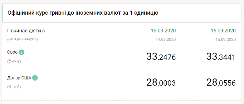 Национальный банк на среду, 16 сентября, ослабил официальный курс гривны к европейской валюте до 33,3441 грн/евро по сравнению с 33,2476 грн/евро днем ранее, передает FaceNews.ua. Об этом говорится в сообщении НБУ.