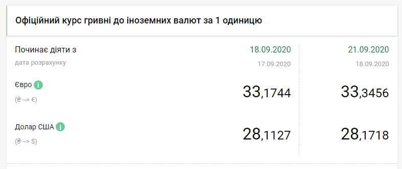 Национальный банк на понедельник, 21 сентября, понизил официальный курс гривны к европейской валюте до 33,3456 грн/евро по сравнению с 33,1714 грн/евро днем ранее, передает FaceNews.ua. Об этом говорится в сообщении НБУ.