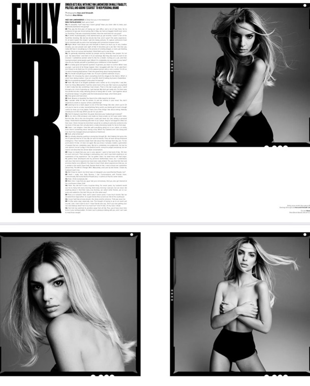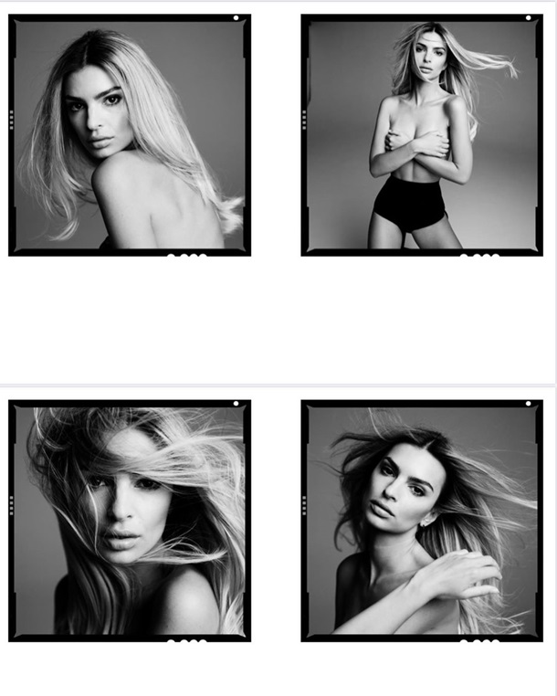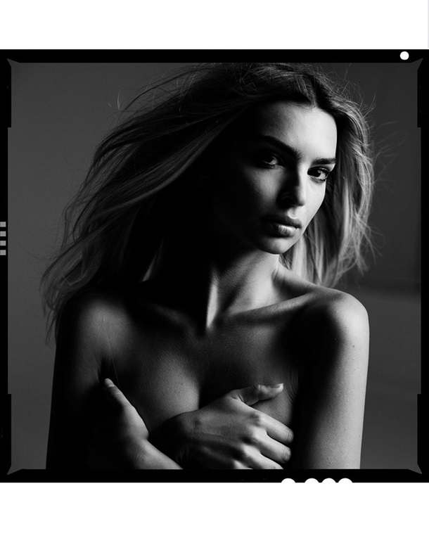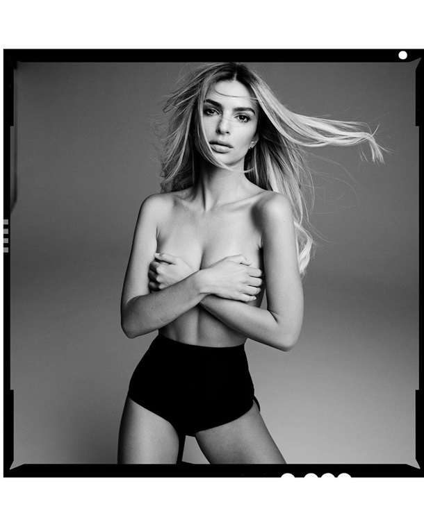 29-летняя Эмили запечатлена топлес. Грудь она прикрывает руками. На Ратаковски только черные трусы с высокой талией.