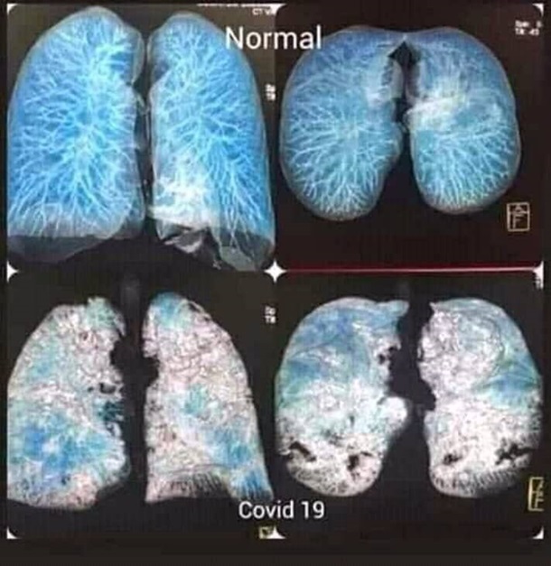 В верхней части размещенной фотографии показаны легкие в нормальном состоянии, внизу - пораженные COVID-19.