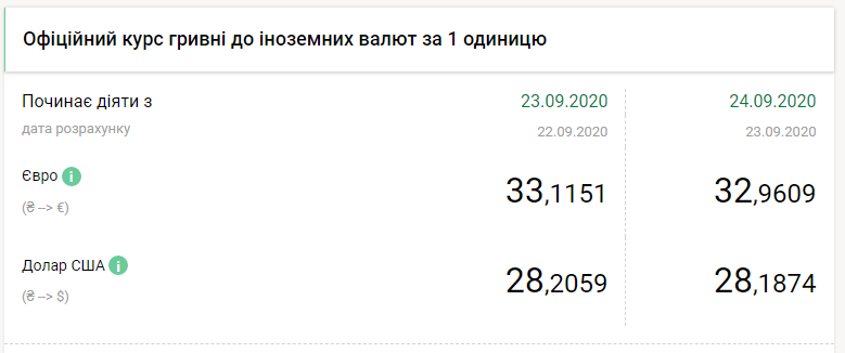 Национальный банк Украины на четверг, 24 сентября, укрепил курс гривны почти на 2 копейки по отношению к доллару и поднял более чем на 15 копеек по отношению к евро, передает FaceNews.ua. Об этом свидетельствуют данные на сайте НБУ..