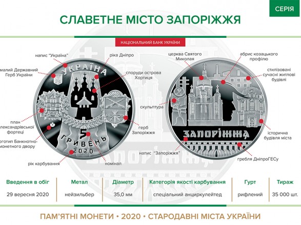 "Памятная монета "Славный город Запорожье" вводится в обращение с 29 сентября 2020 года", - говорится в сообщении пресс-службы НБУ.