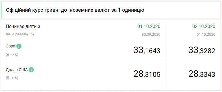 Национальный банк на пятницу, 2 октября, ослабил официальный курс гривны к европейской валюте до 33,3282 грн/евро по сравнению с 33,1643 грн/евро днем ранее, передает FaceNews.ua. Об этом говорится в сообщении НБУ.