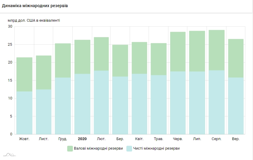 Размер международных резервов Украины в течение сентября 2020 года сократился на 8,7% (на -2 523,01 млн долларов). На 1 октября размер резервов составил 26 525,74 млн долларов, передает FaceNews.ua.