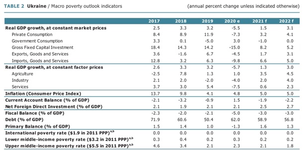 Бедность, рассчитанная на основе международной черты бедности в 5,5 долларов в день, является низкой в Украине и, как ожидается, вырастет на 0,2 п.п. в 2020 году до 2,3%.