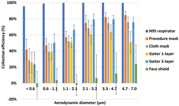 Обычная хирургическая маска заблокировала примерно 59% кашлевого аэрозоля, трехслойная тканевая маска – 51%, бафф из полиэстера – 47% в одном слое и 60%, когда надет в два слоя. Прозрачный щиток для лица заблокировал только 2% аэрозоля от кашля. Между тем, он обеспечивает защиту глаз и лица от крупных капель и брызг.