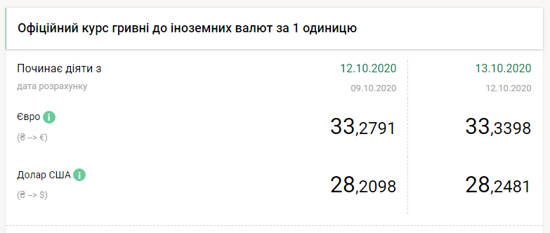 Национальный банк Украины на вторник, 13 октября, ослабил курс гривны на 3 копейки по отношению к доллару и на 6 копеек по отношению к евро, передает FaceNews.ua. Об этом свидетельствуют данные на сайте НБУ в понедельник, 12 октября.