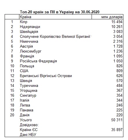 Судя по данным НБУ, крупнейшим иностранным инвестором в Украину является Кипр. Компании, зарегистрированные в этой стране, инвестировали в Украину 15,494 млрд долларов. На втором месте - Нидерланды (10,261 млрд долларов), на третьем - Швейцария (3,083 млрд долларов).