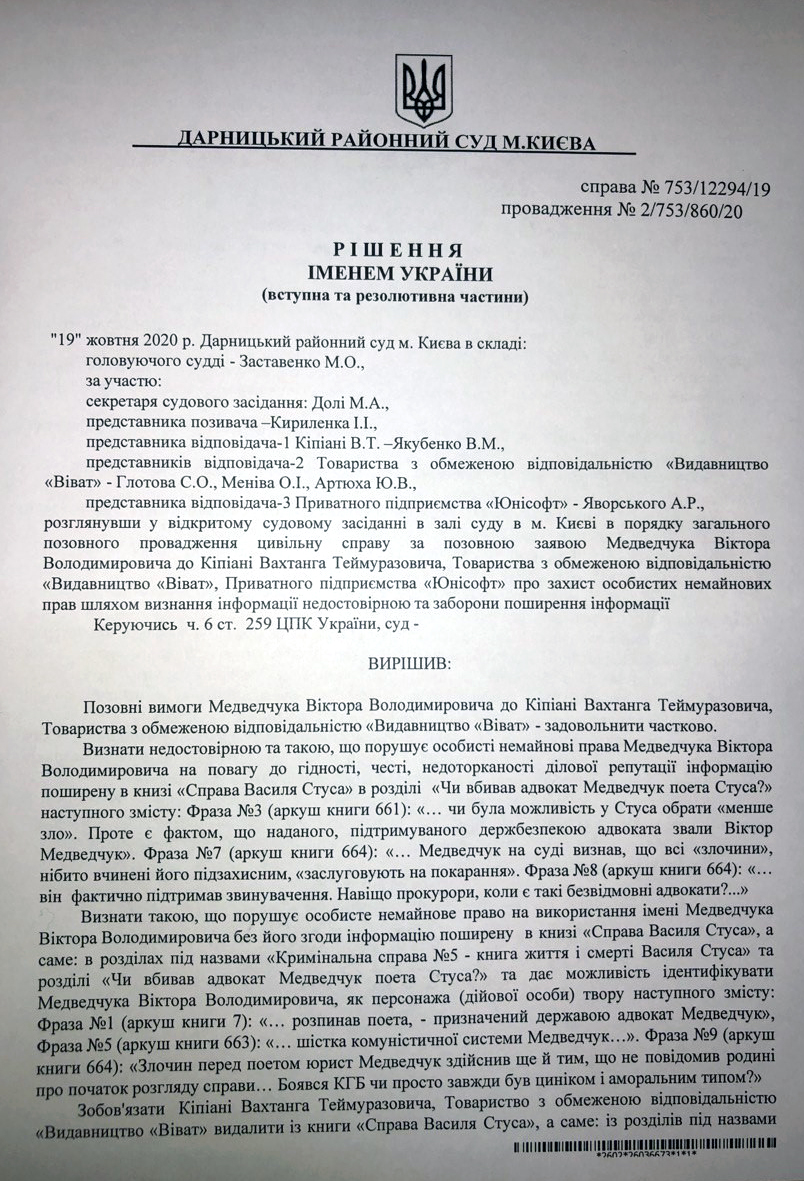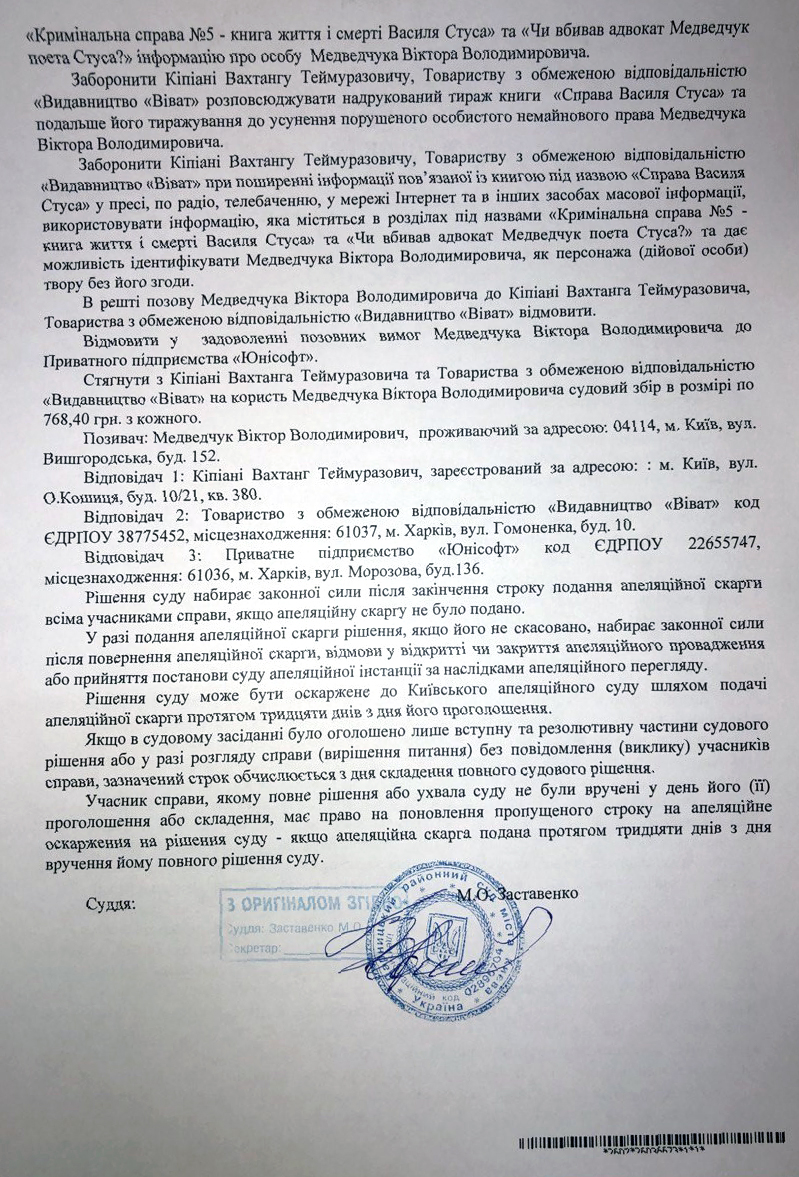 Также автору книги Вахтангу Кипиани и ООО «Виват» при распространении информации, связанной с книгой под названием «Дело Василия Стуса», в прессе, на радио, телевидении, в сети Интернет и других СМИ запрещается использовать информацию, содержащуюся в разделе под названием «Уголовное дело № 5 – книга жизни и смерти Василия Стуса» и ряде других частей книги, которые дают возможность идентифицировать Виктора Медведчука как персонажа (действующее лицо) произведения без его согласия.