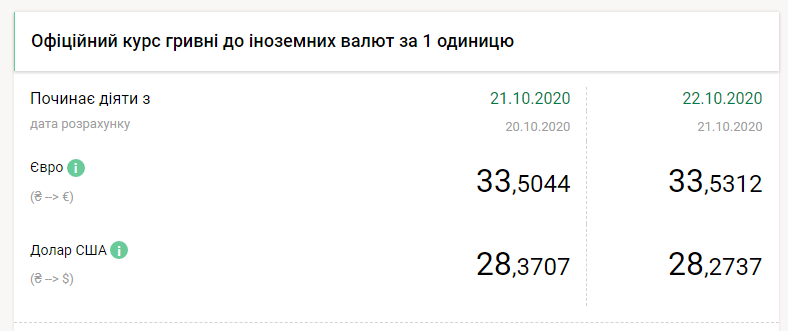 Национальный банк Украины на среду, 21 октября, укрепил курс гривны почти на 10 копеек по отношению к доллару, но опустил почти на 3 копейки к евро, передает FaceNews.ua. Об этом свидетельствуют данные на сайте НБУ.