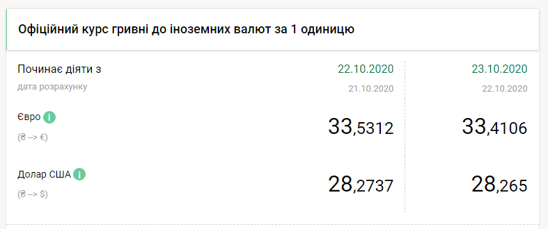 Национальный банк Украины на пятницу, 23 октября, укрепил курс гривны почти на 1 копейку по отношению к доллару и более чем на 12 копеек к евро, передает FaceNews.ua. Об этом свидетельствуют данные на сайте НБУ.