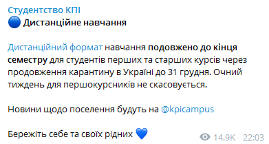 А пресс-служба студсовета КПИ в Telegram-канале сообщила, что дистанционный формат обучения продлен до конца семестра для студентов первых и старших курсов из-за продления карантина в Украине до 31 декабря.