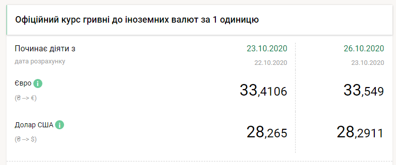 Национальный банк Украины на понедельник, 26 октября, понизил курс гривны более чем на 2 копейки по отношению к доллару и почти чем на 14 копеек к евро, передает FaceNews.ua. Об этом свидетельствуют данные на сайте НБУ в пятницу, 23 октября.