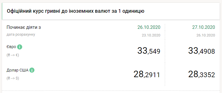 Национальный банк Украины на вторник, 27 октября, понизил курс гривны более чем на 4 копейки по отношению к доллару и укрепил на 5 копеек к евро, передает FaceNews.ua. Об этом свидетельствуют данные на сайте НБУ.