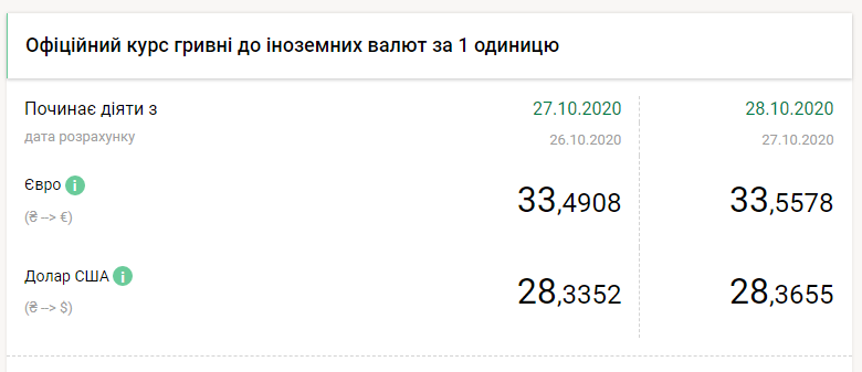 Национальный банк на среду, 28 октября, понизил официальный курс гривны к европейской валюте до 33,5578 грн/евро по сравнению с 33,4908 грн/евро днем ранее, передает FaceNews.ua. Об этом говорится в сообщении НБУ.