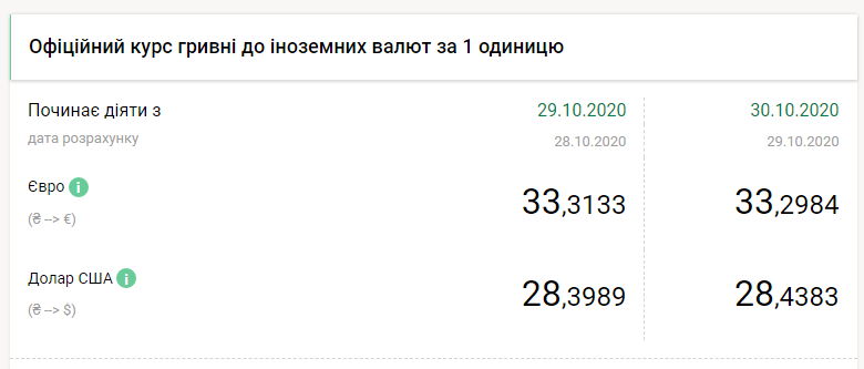 Национальный банк Украины на пятницу, 30 октября, понизил курс гривны на 3 копейки по отношению к доллару и укрепил на копейку к евро, передает FaceNews.ua. Об этом свидетельствуют данные на сайте НБУ.