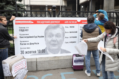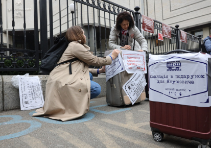 Протестующие пришли под стены КСУ с плакатами "Корупционный суд Украины", "Судей КСУ за решетку", а также принесли чемоданы с наклейками "Коалиция в подарок для Януковича". Кроме этого демонстранты зажгли файеры.