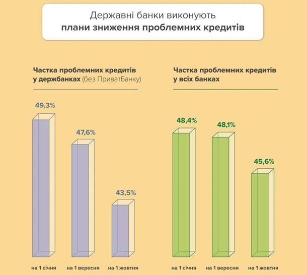 Госбанки начали выполнять планы по очистке балансов от наследства прошлых лет - проблемных кредитов (NPL). В сентябре 2020 государственный Укрэксимбанк списал с баланса 16,6 млрд грн неработающих кредитов, под которые были ранее сформирован 100% резервов. Так доля проблемных кредитов в госбанках (без учета ПриватБанка) сократилась с 47,6% на 1 сентября до 43,5% на 1 октября.