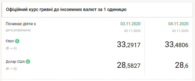 Национальный банк на среду, 4 ноября, понизил официальный курс гривны к европейской валюте до 33,4806 грн/евро по сравнению с 33,2917 грн/евро днем ранее, передает FaceNews.ua. Об этом говорится в сообщении НБУ.